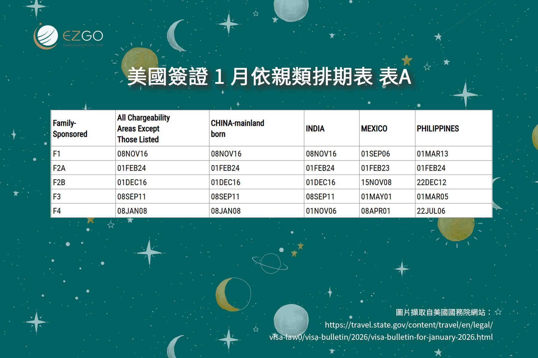 2 月份依親移民和職業移民排期與上個月相比有些變化,具體數據請看圖片內容。 美國依親簽證排期 根據排期表A(Final Action Dates