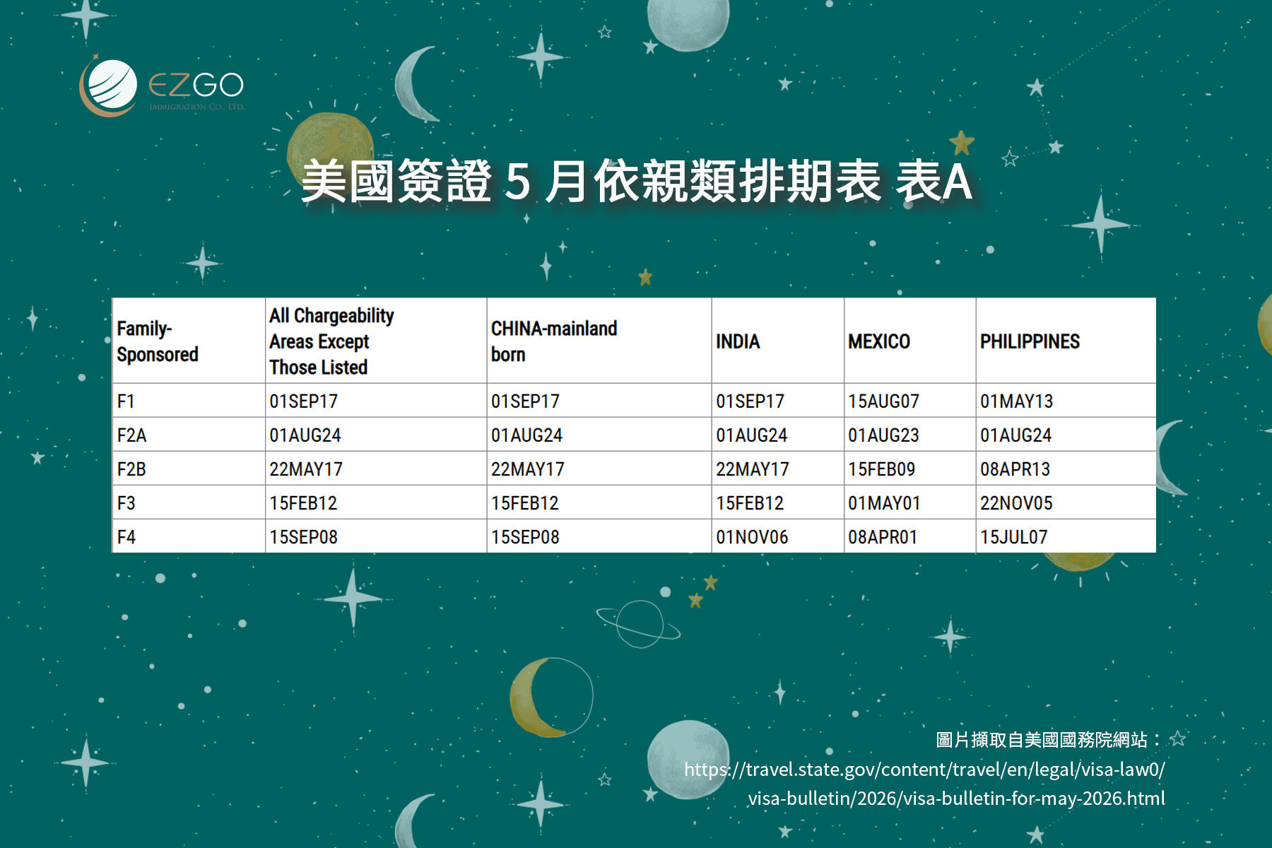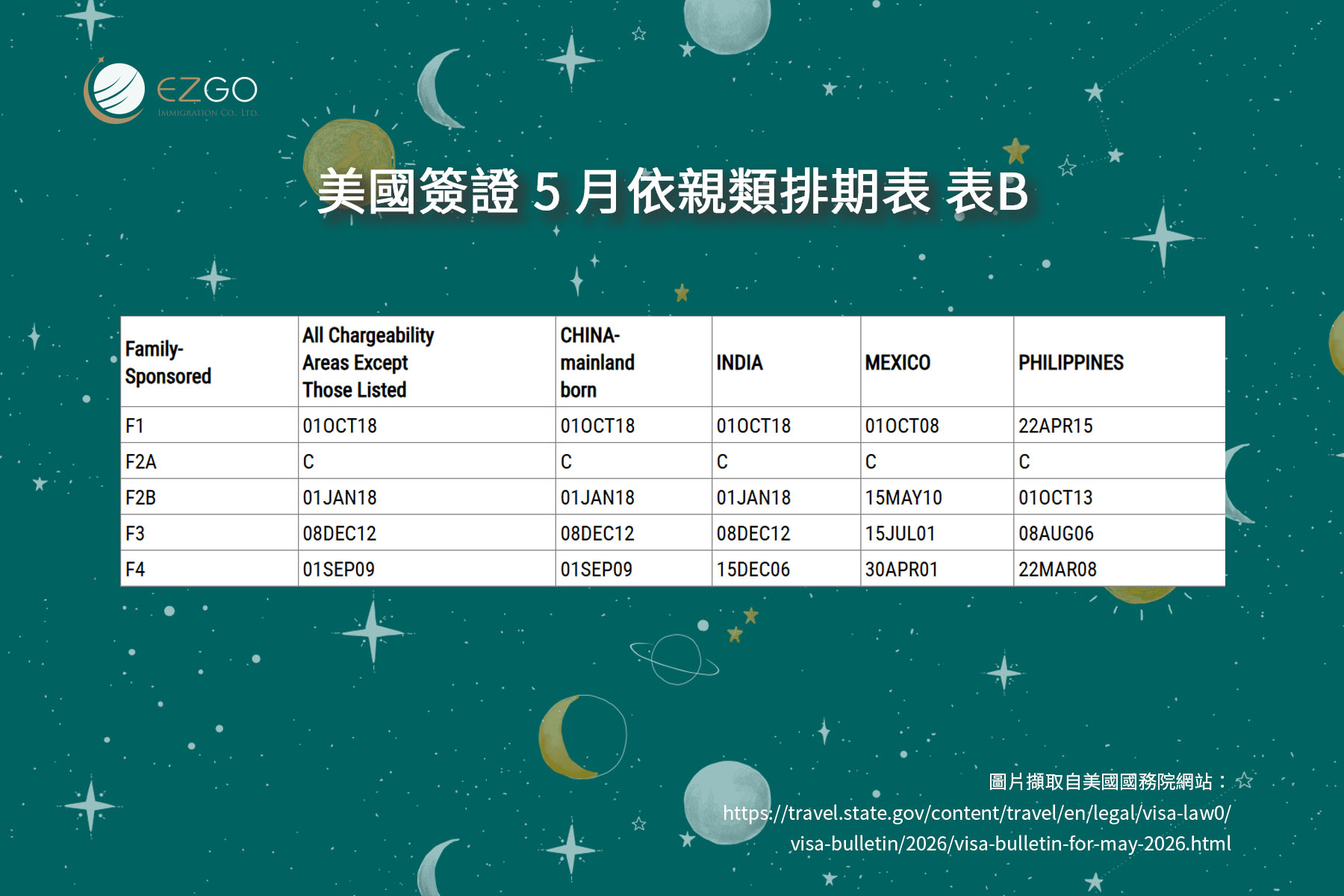 整體來看,2026年5月美國移民排期最大的變化主要來自親屬/依親移民類別,F1、F2A、F2B、F3、F4 均明顯前進;職業移民方面則維持穩定,其中 EB-1、EB-2、EB-5 持續無排期,EB-5 投資移民對台灣申請人而言仍具相對優勢。